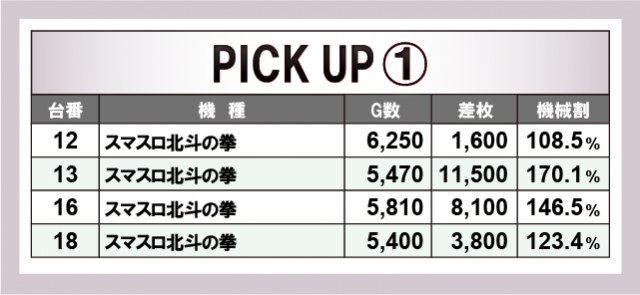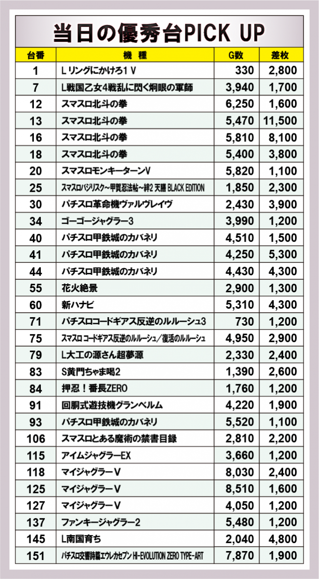 まずは優秀台30台の紹介から。30台のうち15台が+2,000枚オーバーで、+3,000枚オーバーは8台出現。それらのなかでもっとも優秀な成績を収めたのが、13番台の「スマスロ北斗の拳」で、差枚+11,500枚と圧倒的! また、優秀30台全体を見渡してみるとスマスロが大半を占めるなか、「マイジャグラーⅤ」などのジャグラーシリーズも多数ランクイン。ハイスペック機種からノーマルタイプまで、幅広い機種にチャンスが隠されていたようだ!