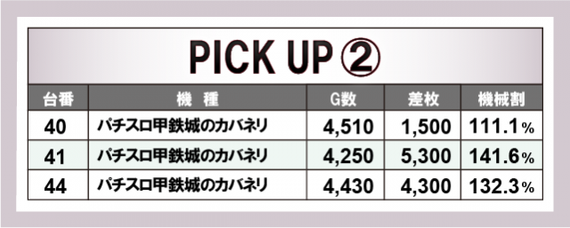 続いては、当日とくに賑わいを見せた2機種を紹介していこう。まず「スマスロ北斗の拳」は、この日の最高差枚数を獲得した13番台+11,500枚を筆頭にピックアップ4台の平均差枚が+6,250枚と素晴らしい結果を残していた!次いで、6.5号機で不動の人気を誇る「パチスロ甲鉄城のカバネリ」で、41番台+5,300枚を筆頭に大きなポテンシャルが秘められており、好状況だった様子。 これら2機種が当日もっとも賑わっていた機種で間違いないだろう!