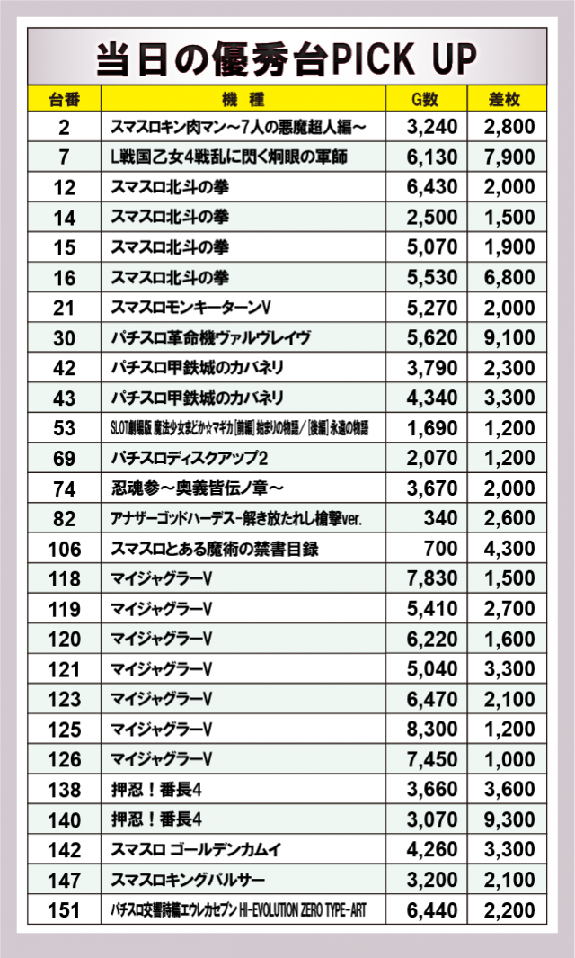 まずは優秀台30台のチェックから。30台のうち19台が+2,000枚オーバーを記録し、+3,000枚オーバーは9台出現。それらのなかでもっとも優秀だったのは、140番台「押忍!番長4」で+9,300枚を獲得!その他ランクイン機種を詳しく見てみると、30番台「パチスロ革命機ヴァルヴレイヴ」+9,100枚や、7番台「L戦国乙女4戦乱に閃く炯眼の軍師」+7,900枚などスマスロ人気台を筆頭に新台からノーマルタイプまで様々な機種がランクイン。誰もが楽しめるように、店内の至るところにチャンスが隠されていたようだ!