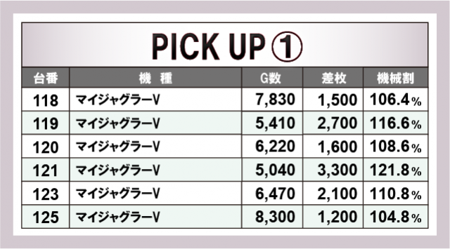 「マイジャグラーⅤ」では、121番台・+3,300枚を筆頭にピックアップ6台全てが4桁プラス!6台の総差枚数は+12,000枚オーバーを記録し、ノーマルタイプながらアベレージの高い結果をマークした!