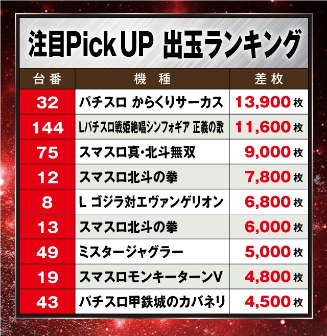 そのほか北斗シリーズも盛況で『スマスロ真・北斗無双』が+9,000枚、『スマスロ北斗の拳』が+7,800枚、+6,000枚と、多くのファンを楽しませていた。