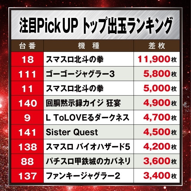 また、その他の機種で目立っていたのが導入直後の最新台で、『回胴黙示録カイジ 狂宴』の+4,900枚をはじめ『Sister Quest』から+4,500枚、『スマスロ バイオハザード5』から+4,200枚といった好成績が飛び出している。