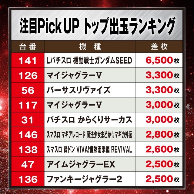 この日は、人気機種を中心に多数の好調台を確認。そんな中、最もプレイヤーの注目を集めたのが『Lパチスロ 機動戦士ガンダムSEED』で、141番台が+6,500枚を叩き出しランキングトップに輝いた。