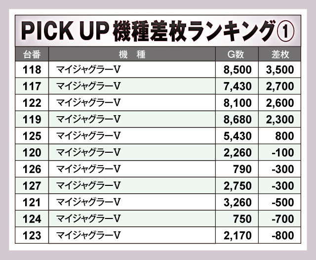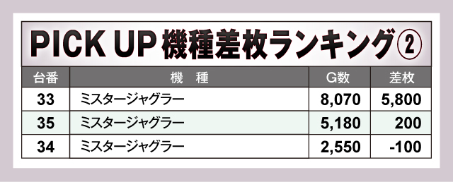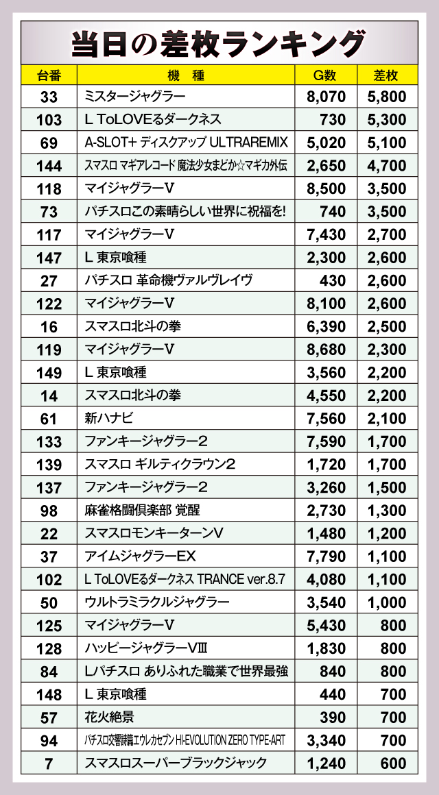 まずは差枚ランキングのチェックから。30台のうち15台が+2,000枚オーバーで、+3,000枚オーバーは6台出現。それらのなかでもっとも優秀だったのは、33番台の「ミスタージャグラー」で、差枚は+5,800枚を獲得! 並み居るスマスロ勢を押し除けて『ジャグラー』がトップに立つのは、Aタイプファンにとって喜ばしいことだったであろう。またその他を見てみると、スマスロからAタイプまで様々な機種がランクインしており、多くの機種にチャンスがあったことがよくわかる。