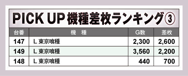 続いては、当日店内を盛り上げた3機種をチェックしていこう。先ほど紹介した『ミスタージャグラー』以外に『マイジャグラーⅤ』も大健闘。+2,000枚オーバーが4台も登場し、大いに盛り上がっていた。また、『L 東京喰種』は設置3台がすべてプラス収支と、店内でもとくに目立つ存在となっていた。