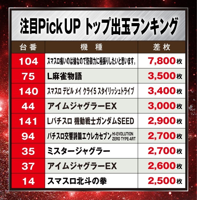 この日は、人気機種を中心に多数の好調台を確認。そんな中、最もプレイヤーの注目を集めたのが『スマスロ痛いのは嫌なので防御力に極振りしたいと思います。』で、104番台が+7,800枚を叩き出しランキングトップに輝いた。