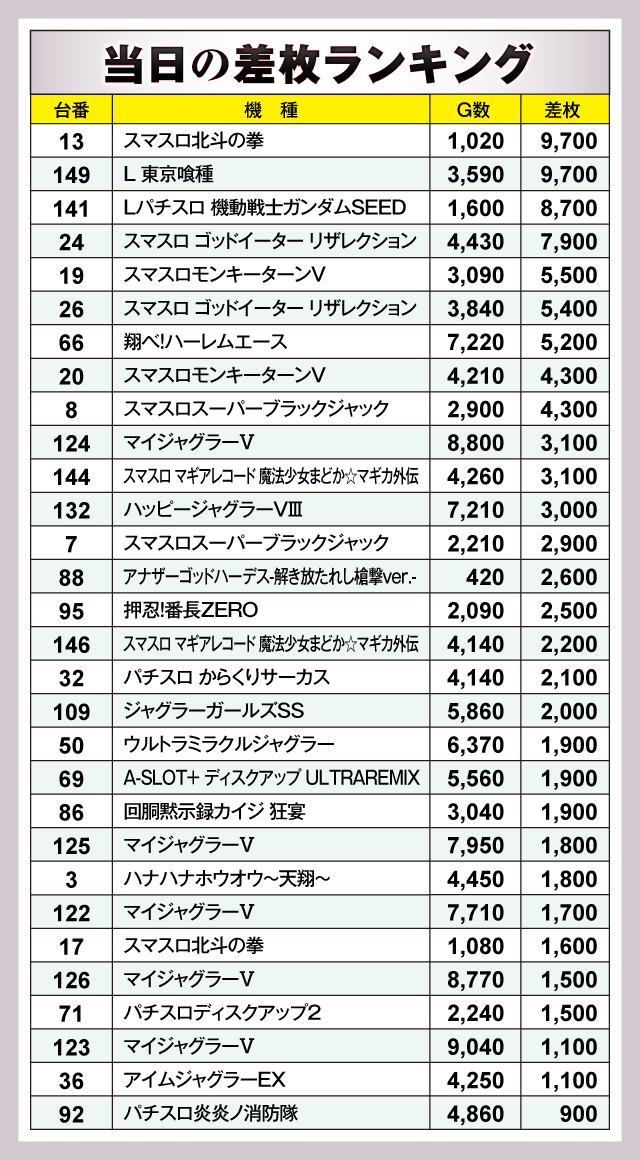 まずは当日の差枚ランキングを紹介していこう。30台のうち18台が差枚+2,000枚オーバーで、+5,000枚オーバーは7台出現。それらのなかでもっとも優秀だった台は、13番台の「スマスロ北斗の拳」と149番台の「L 東京喰種」で、差枚は万枚まであと一歩となる+9,700枚を獲得! 他にも多くの人気スマスロがランクインしており、その実力の高さを証明する結果となった。