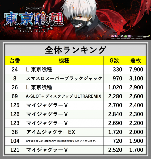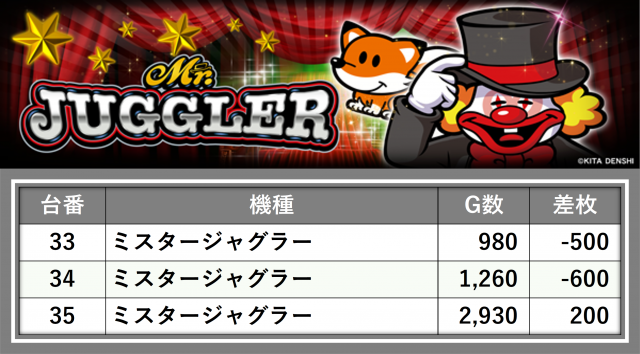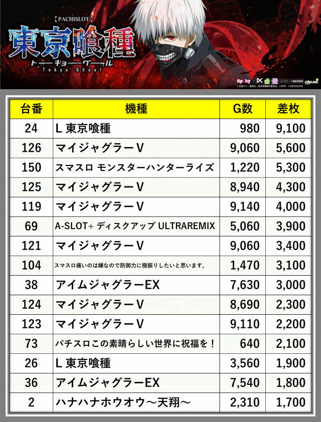 厳選された取材対象機種をはじめ、その他スロット全体から好記録が飛び出した!プレイヤーが楽しんだ1日を下記データにて振り返ってみて欲しい。