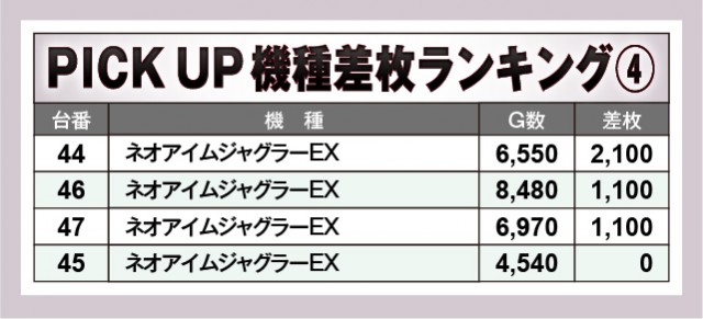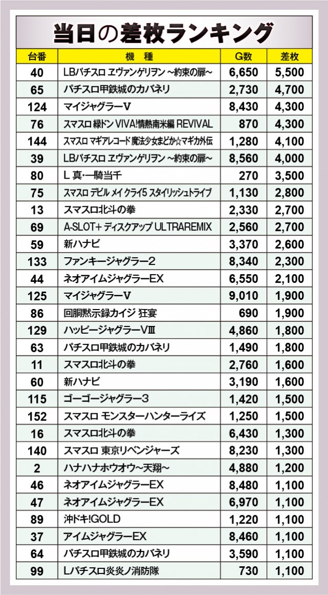 『LBパチスロ ヱヴァンゲリヲン ~約束の扉~』から5,500枚・4,000枚と大きな熱量を確認でき、ファンは次のボーナスを求めて力強くレバーを叩いていた。それは『ネオアイムジャグラーEX』も同様で、右肩上がりのグラフを描いていた様子も特筆すべきポイントである。またAT機も『スマスロ北斗の拳』はコンスタントに大当りを射止め、『パチスロ甲鉄城のカバネリ』もメダル機ながら4,700枚と気を吐いていたのが鮮烈だ。