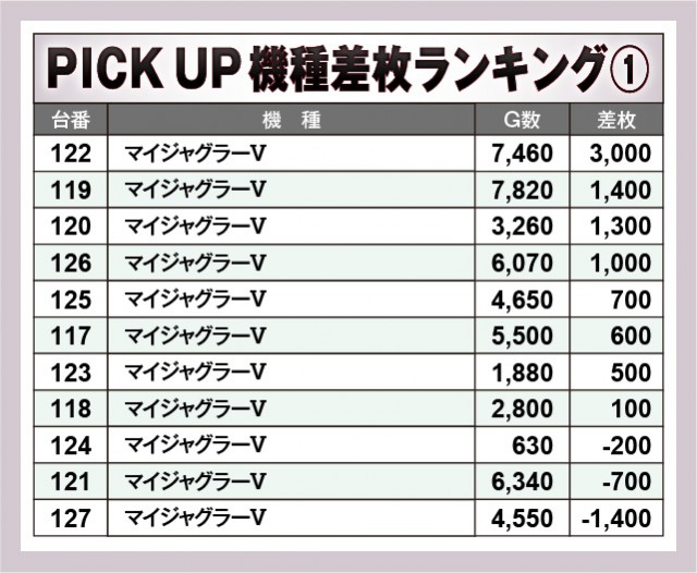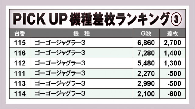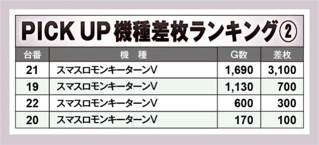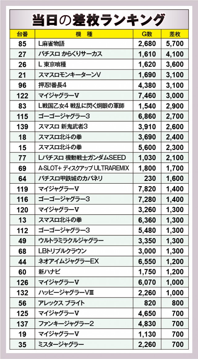 『マイジャグラーⅤ』『ゴーゴージャグラー3』の両機種はシリーズの中でも際立った存在感を放っていた。回転数と差枚数が比例する展開を披露していたのはもちろん、朝から閉店までじっくりと打ち込まれていた様子も確認できる。それほど好感触を掴める状況が整っていたと窺えるばかりで、ファンが一心不乱にレバーを叩いていたのは間違いない。また『スマスロモンキーターンV』もまとまった出玉を確保しており、人気を博する理由を見せつけていたのもポイントだ。