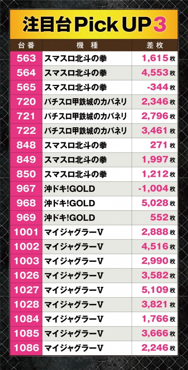 最後は並び。なんと3台並びが7か所もあり、多くのプレイヤーを楽しませていた。『沖ドキ!GOLD』や『マイジャグラーⅤ』では5,000枚オーバーと、機種のポテンシャルをいかんなく発揮している。また『マイジャグラーⅤ』は3か所すべてプラスと絶好調だった。