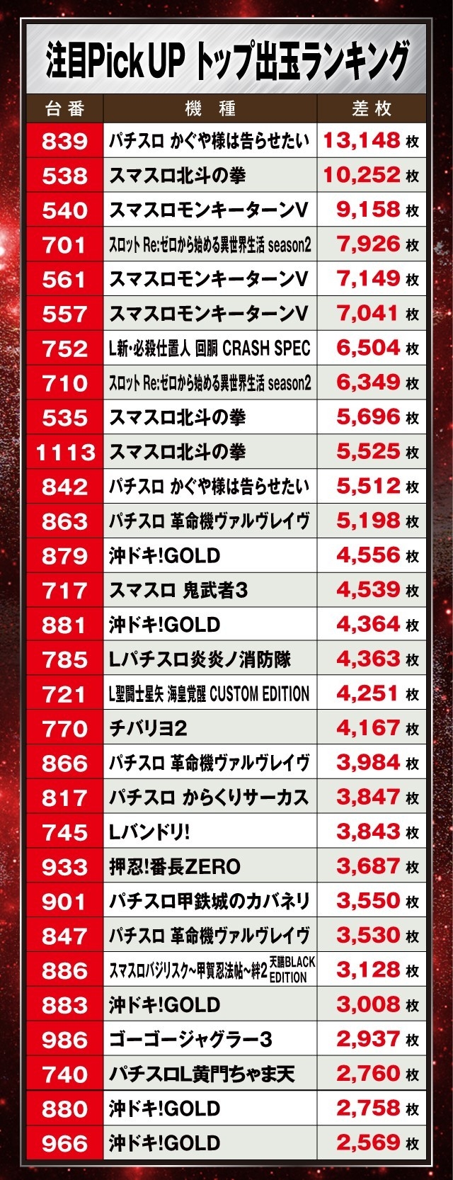 この日、最も目立っていたのが『パチスロ かぐや様は告らせたい』で、839番台が万枚超の+13,148枚を記録しランキングトップに、さらに842番台が+5,000枚超と複数の台が見事な成績を残している。