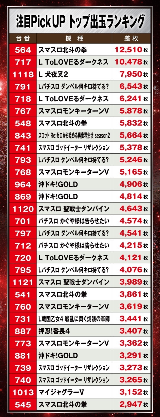 また、その他の機種で目立っていたのが『Lパチスロ ダンベル何キロ持てる?』で、791番台の+6,543枚を筆頭に+4,000枚超の台が複数発生しランキング上位に名を連ねている。