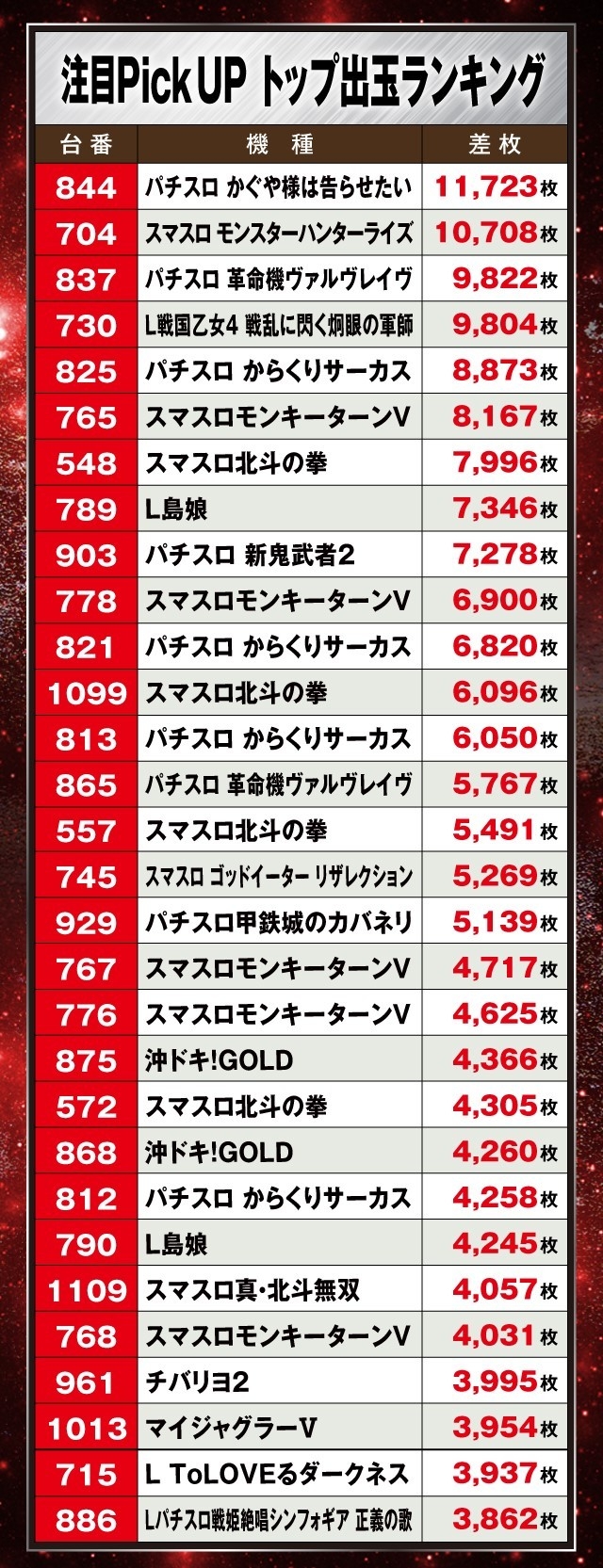 この日の店内状況をチェックすると、『パチスロ かぐや様は告らせたい』で+11,723枚、『スマスロ モンスターハンターライズ』で+10,708枚と、ランキング上位が実にハイレベルな成績を叩き出しプレイヤーの注目を集めていた。