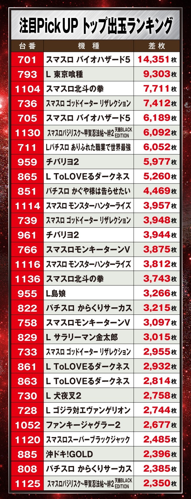 この日、最もプレイヤーの注目を集めていたのが『スマスロ バイオハザード5』で、701番台が圧巻の+14,351枚を叩き出しランキングトップに。さらに、705番台も+6,189枚を記録し差枚ベスト5に2台がランクインする盛況ぶりを見せていた。