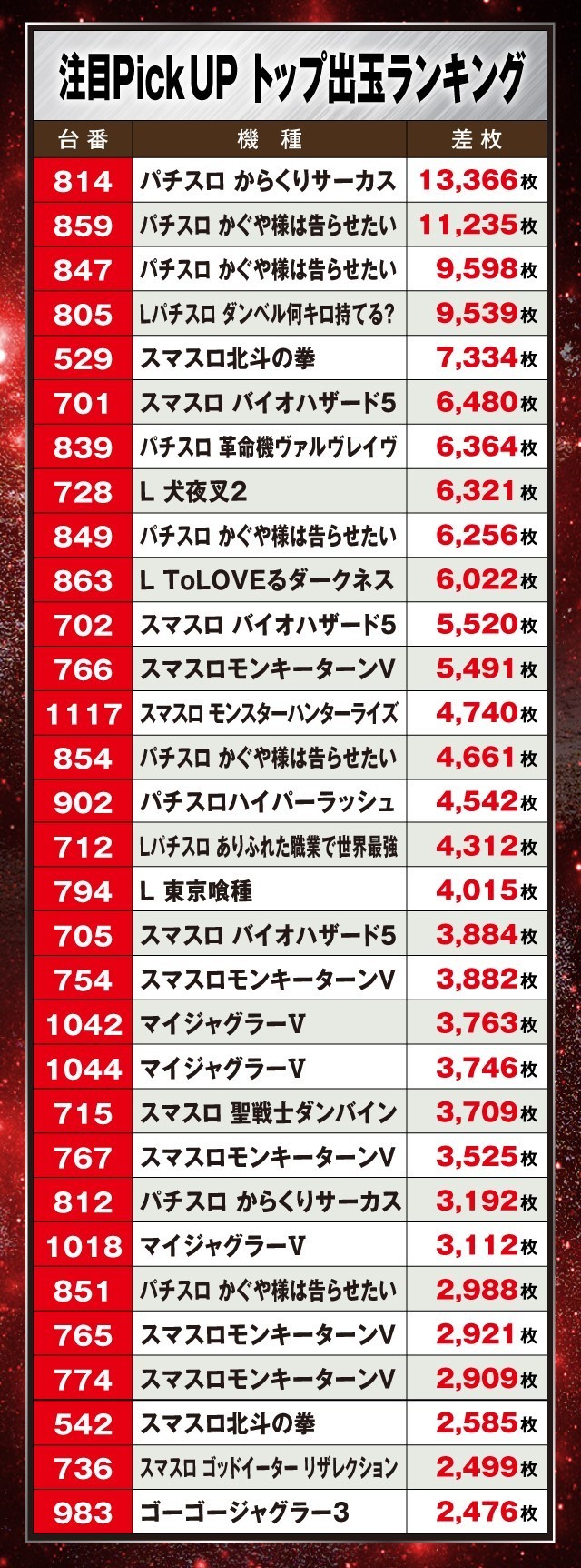この日は、人気のスマスロを中心に多数の好調台を確認。そんな中、『パチスロ からくりサーカス』が怒涛の+13,366枚を叩き出しランキングトップに。続く『パチスロ かぐや様は告らせたい』からも+11,235枚に+9,598枚といったハイスコアが連発し店内を盛り上げていた。