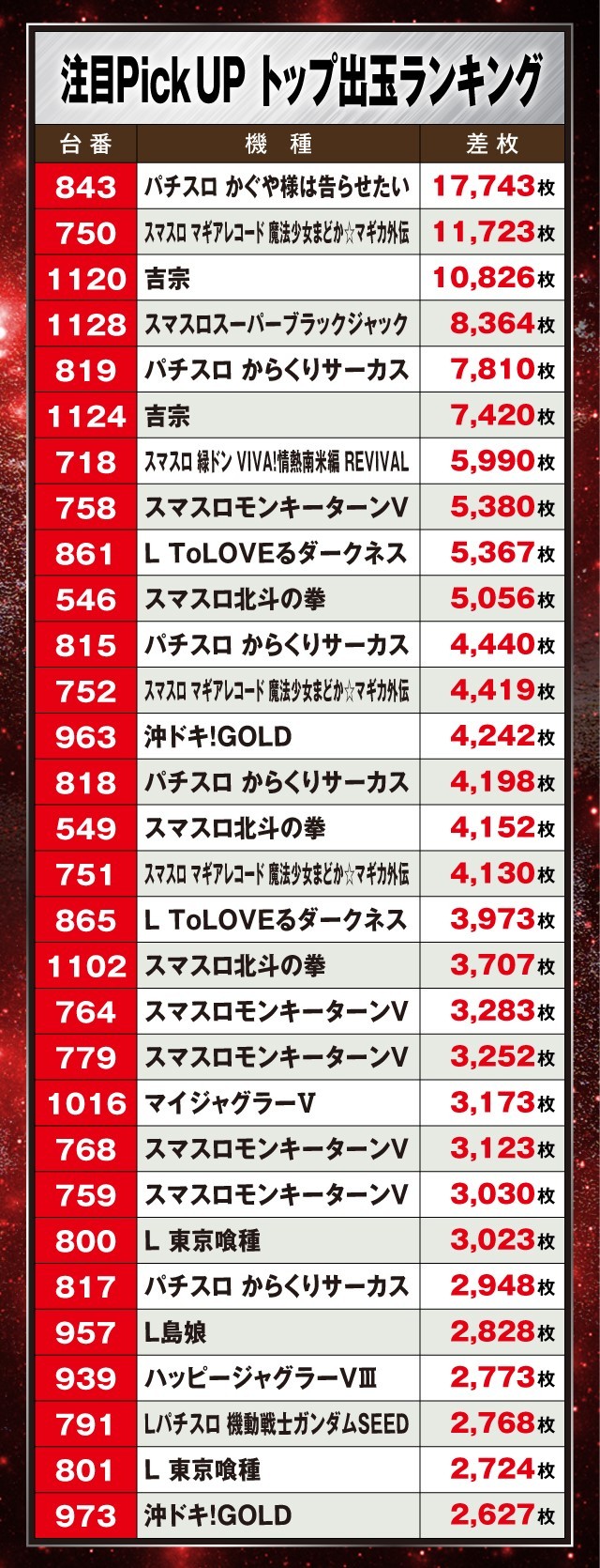 この日、最もプレイヤーの注目を集めたのが『パチスロ かぐや様は告らせたい』で、843番台が怒涛の+17,743枚を叩き出しランキングトップに。続く『スマスロ マギアレコード 魔法少女まどか☆マギカ外伝』と『吉宗』も万枚超を達成する盛況ぶりを見せ店内を盛り上げていた。
