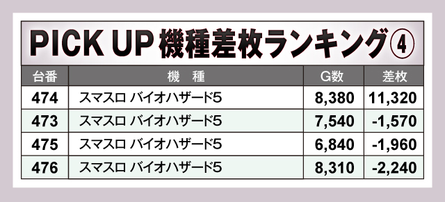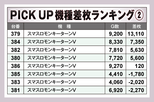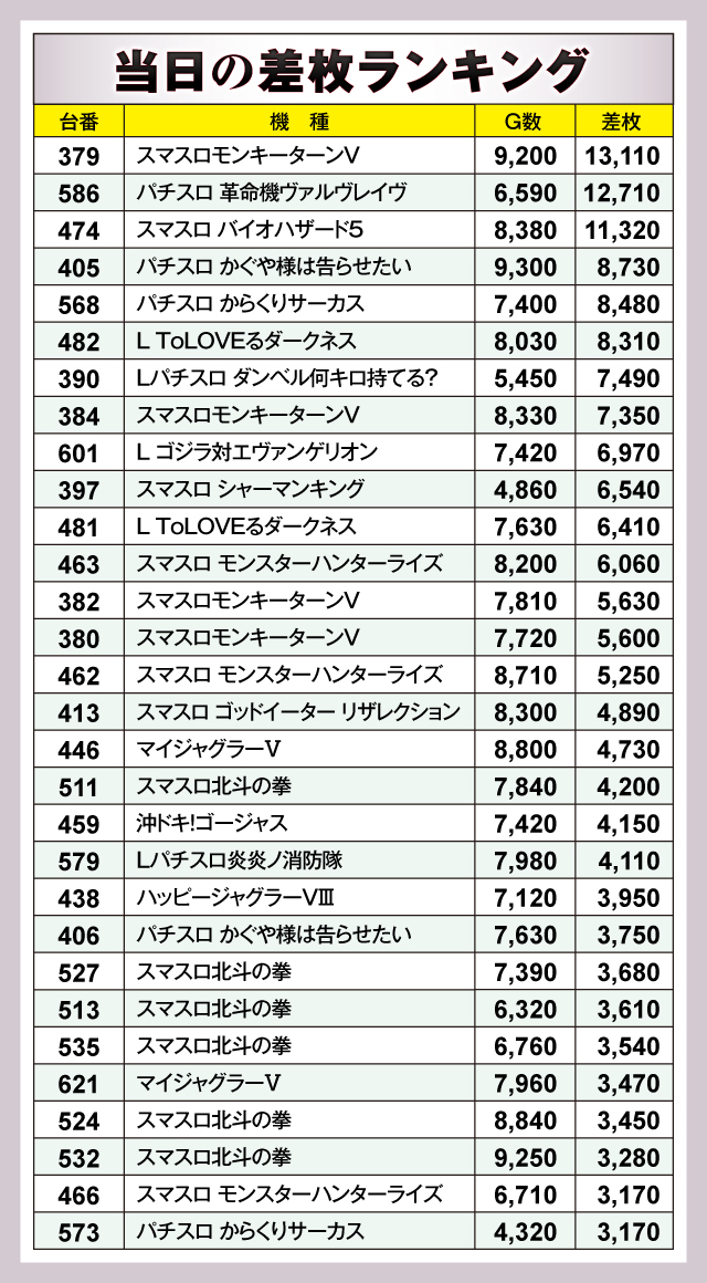 まずは当日の差枚ランキングを紹介していこう。30台すべてが驚きの+3,000枚オーバーで、+5,000枚オーバーは15台も出現。それらのなかでもっとも優秀だったのは、379番台の「スマスロモンキーターンV」で、差枚は+13,110枚を獲得! その他にも、「パチスロ 革命機ヴァルヴレイヴ」「スマスロ バイオハザード5」で万枚オーバーを記録するなど、膨大な熱量があちこちで発生していた!