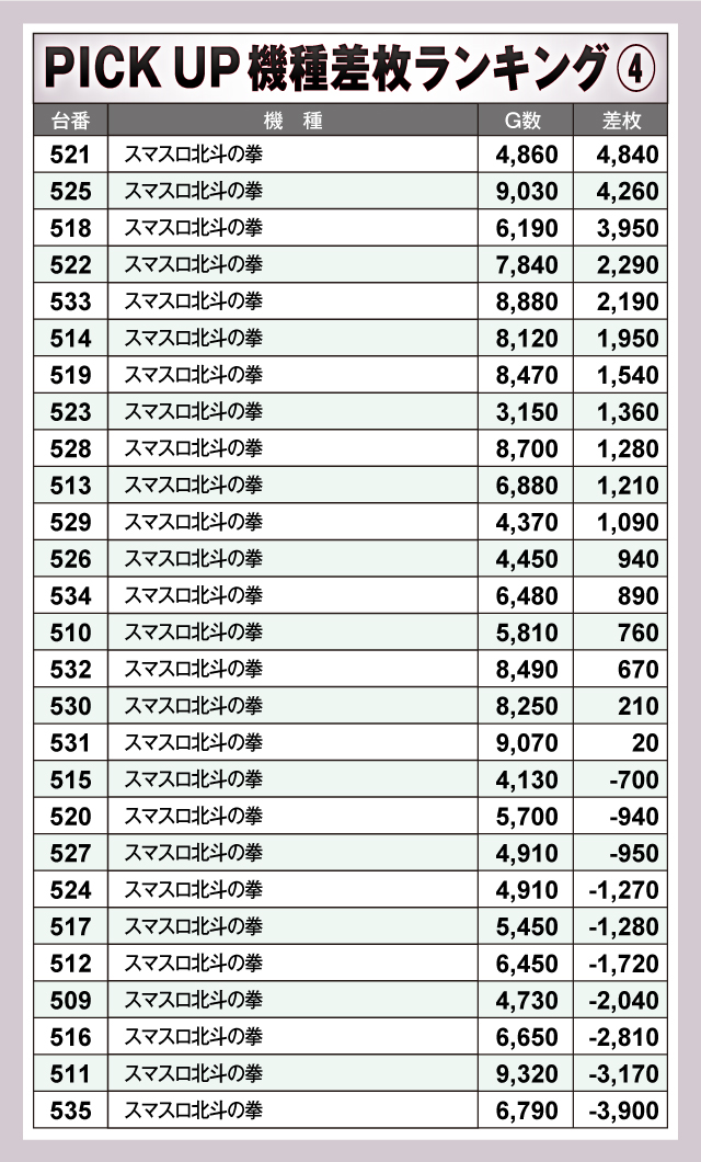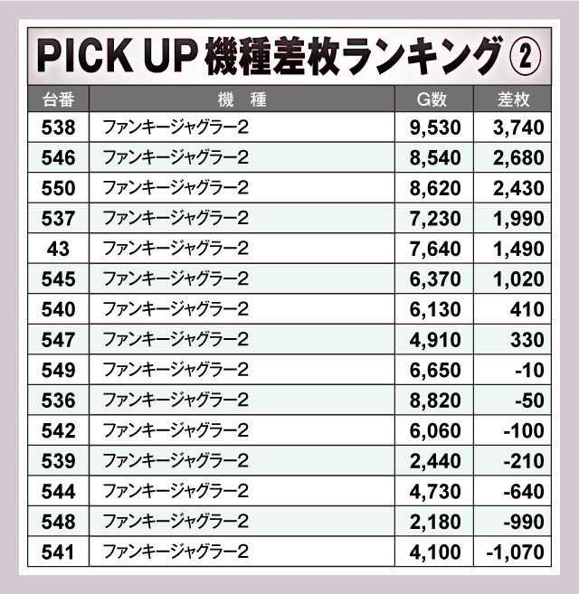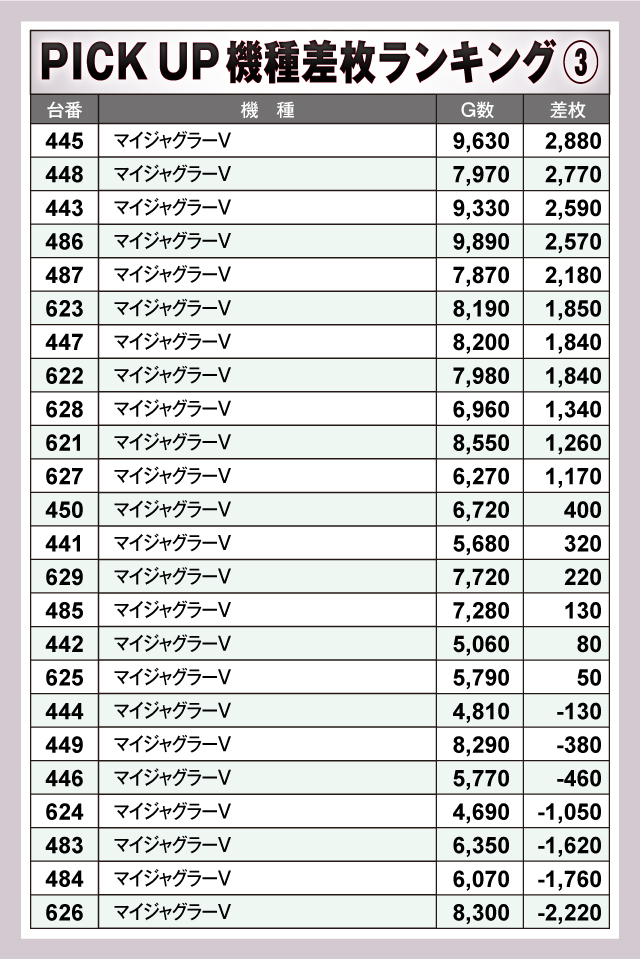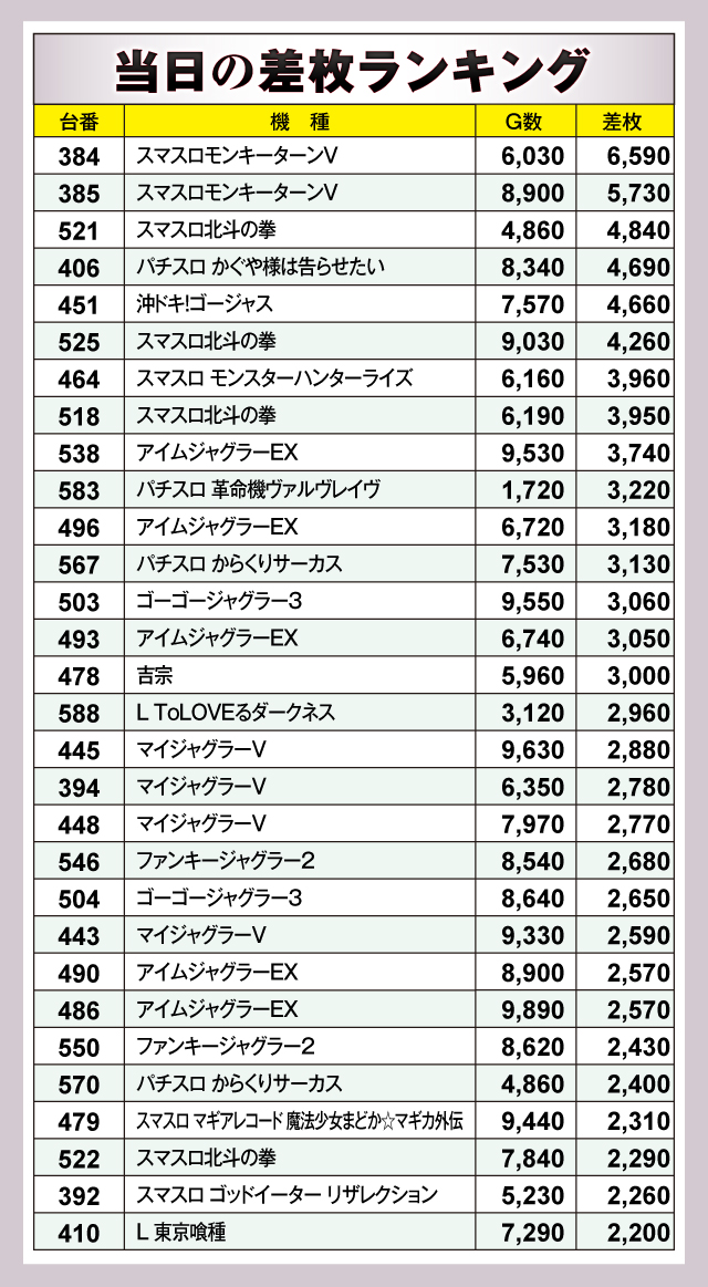 まずは当日の差枚ランキングを紹介していこう。30台すべてが差枚+2,000枚オーバーで、+3,000枚オーバーは15台出現。それらのなかでもっとも優秀だった台は、384番台の「スマスロモンキーターンV」で、差枚は+6,590枚を獲得! その他ランクイン機種には、人気台から最新台など多種多様な機種がランクイン。とくにジャグラーシリーズの活躍が目立っていたぞ!
