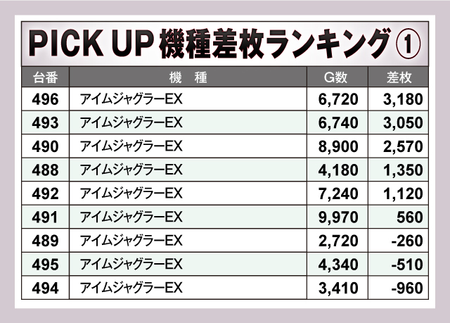 続いては、当日店内を大いに盛り上げた4機種をチェック。4機種全てから良台が出現していたが、とくに注目して欲しいのは「アイムジャグラーEX」の盛り上がり。ピックアップ9台のうち6台がプラス終了で、そのうち5台が差枚+1,000枚超えと上々の結果をマーク! その他の機種も活躍しており、もちろんこれらの機種以外からも良台はアチコチに出現していた!