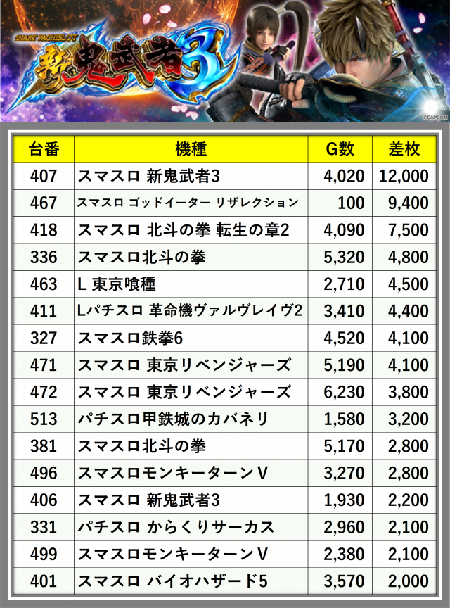 厳選された取材対象機種をはじめ、その他スロット全体から好記録が飛び出した!プレイヤーが楽しんだ1日を下記データにて振り返ってみて欲しい。