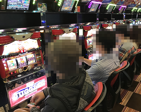 さまざまなスペックの機種が盛り上がっているなかで、とくに厚い支持を受けていたのはジャグラーシリーズ。なかでも、笑顔のプレイヤーが多い「マイジャグラーⅣ」にひときわ明るい光景が広がっていた。