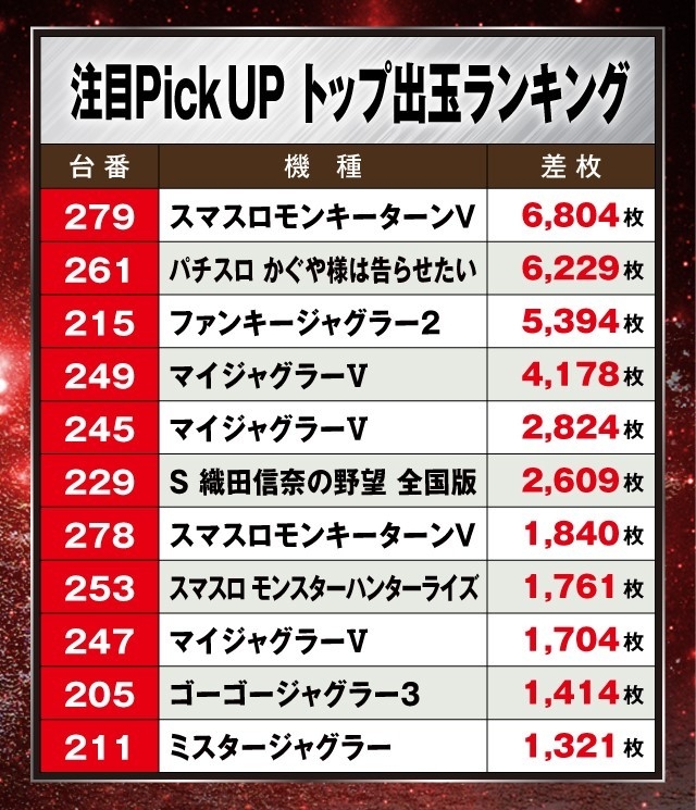 この日、ランキングトップに輝いたのは、いまだ人気の衰えない大ヒット機種『スマスロモンキーターンV』で+6,804枚を記録。続く2位には、僅差の+6,229枚で『パチスロ かぐや様は告らせたい』がランクインしている。