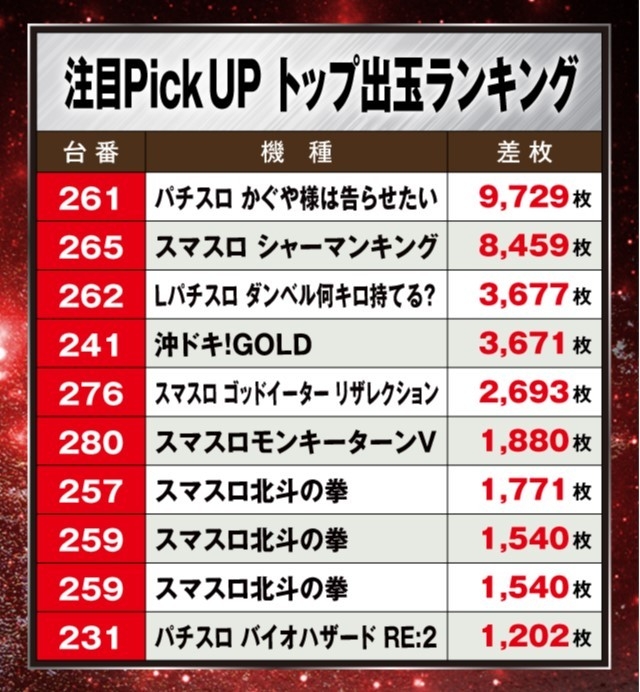 この日、最もプレイヤーの注目を集めたのが『パチスロ かぐや様は告らせたい』で、261番台が万枚目前の+9,729枚を叩き出しランキングトップに。次いで、導入間もない新台の『スマスロ シャーマンキング』が+8,459枚を記録、そのポテンシャルの高さを早くもアピールしていた。