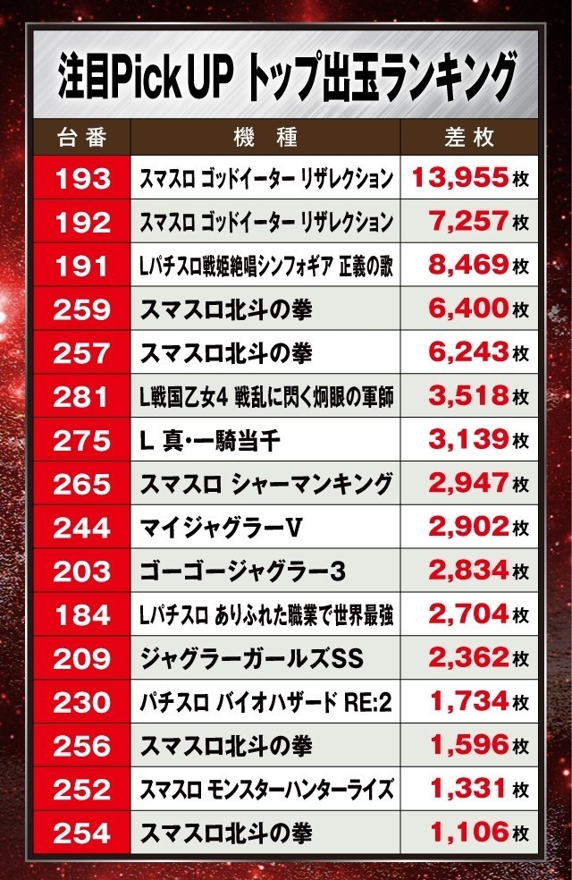 この日は、なんといっても『スマスロ ゴッドイーター リザレクション』がアツかった!! 193番台の+13,955枚に192番台の+7,257枚と、2台並びでハイスコアを叩き出す圧巻のワン・ツーフィニッシュを決めている。