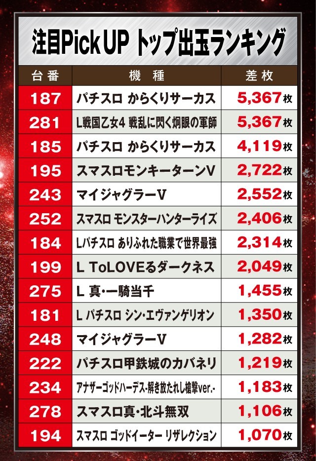 この日、最もプレイヤーの注目を集めていたのが『パチスロ からくりサーカス』で、+5,367枚に+4,119枚といったハイスコアを連発させ、ベスト3に2台がランクインする盛況ぶりを見せていた。