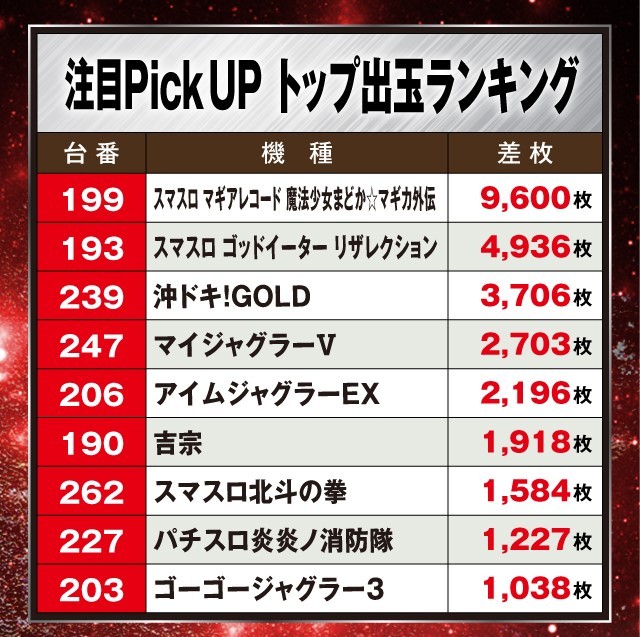 この日の店内状況をチェックすると、『スマスロ マギアレコード 魔法少女まどか☆マギカ外伝』が万枚目前の+9,600枚を叩き出しランキングトップに。次いで『スマスロ ゴッドイーター リザレクション』から+4,936枚、『沖ドキ!GOLD』から+3,706枚が確認されている。