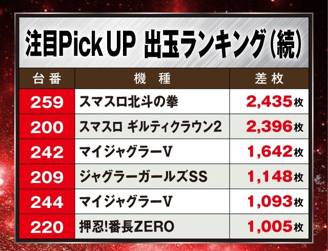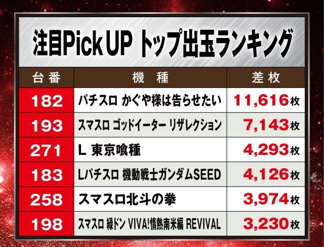 また、その他の機種では『L 東京喰種』と『Lパチスロ 機動戦士ガンダムSEED』が+4,000枚を記録。さらに、導入直後の新台『スマスロ ギルティクラウン2』も好成績を残し差枚TOP10にランクインしている。