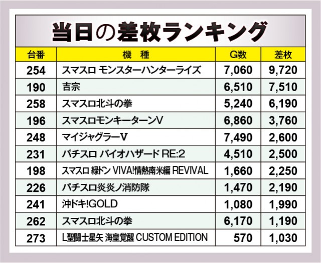『スマスロ モンスターハンターライズ』は惜しくも万枚を逃す9,720枚となっており、店内の盛り上がりを大きく牽引。さらに『吉宗』『スマスロ北斗の拳』も大台突破で気を吐いており、ファンは大きな熱量に高揚感を抑えきれなかったはずだ。また好感触を得てじっくりと打ち込んだ姿も鮮烈で、遊技を心から楽しめたに違いない。