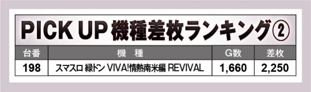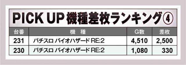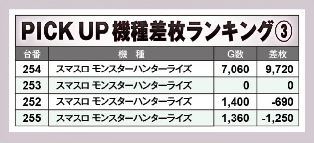 上表の機種はいずれもポテンシャルを秘めており、『スマスロ モンスターハンターライズ』を筆頭に熱気に満ちていたのが目に焼きつくばかり。その中でメダル機ながら『パチスロ バイオハザード RE:2』が全台プラス差枚数を達成しており、その存在をアピールしていたのも見逃せない。遊技していたファンの満足度も高く、笑顔が咲き乱れたエリアとなっていた。