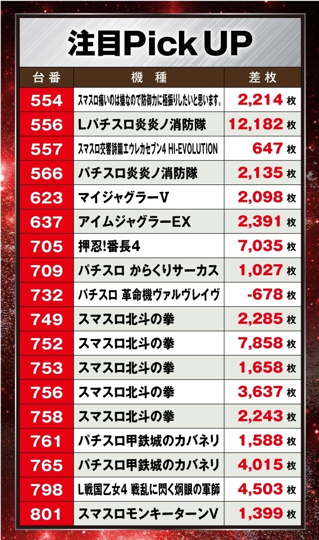 また『スマスロ北斗の拳』では752番台の+7,858枚をはじめ、対象となった5台全てがプラスで終了、平均差枚は脅威の+3,536枚という見事な結果を残している。