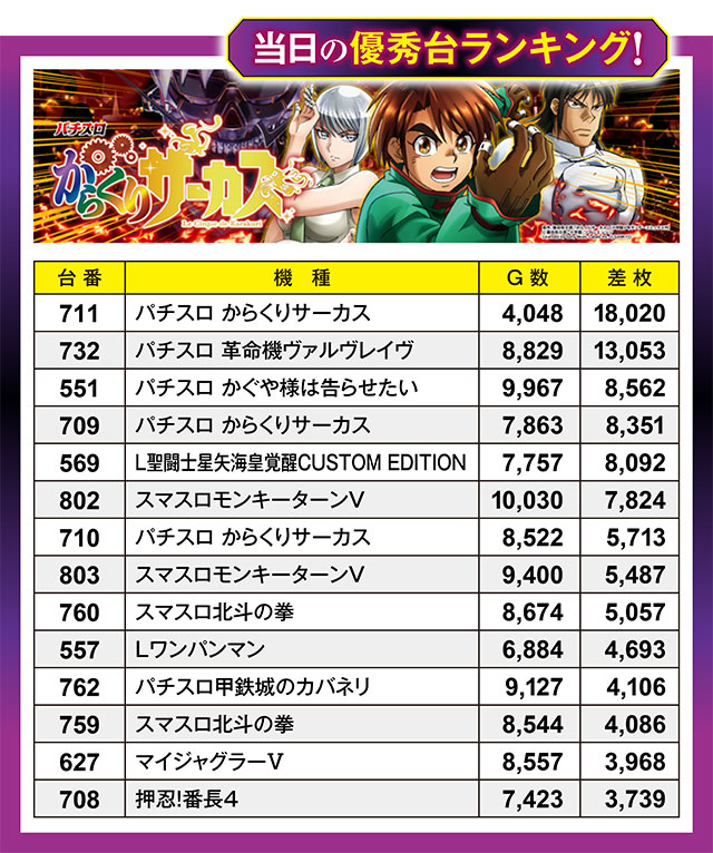 前回の『スマスロ ゴッドイーター リザレクション』に引き続き、この日は『パチスロ からくりサーカス』が18,000枚超えレコードでコンプリートを達成!さらに『パチスロ 革命機ヴァルヴレイヴ』が13,000枚超え、5,000枚超えが計9台も誕生するなど、モンスタレコード揃い踏みといった様相を呈していた。