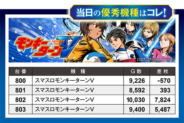同じく『スマスロモンキーターンV』も4台中3台がプラスに。802番台・803番台が5,000枚オーバー、唯一マイナスの800番台もわずかなマイナス値。4台ともにチャンスがあった可能性は十分だ。
