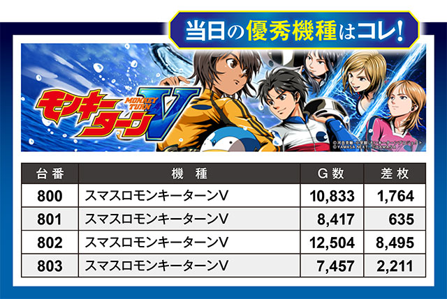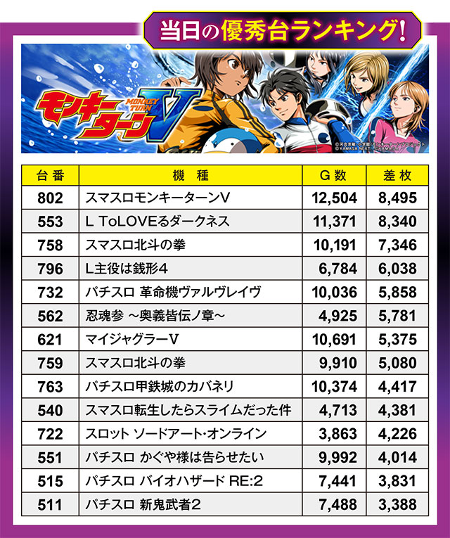 8,000枚を超える記録で、『スマスロモンキーターンV』が今回のTOPスコアの座を勝ち取った。僅差で2位に甘んじた『L ToLOVEるダークネス』、2台が5,000枚超えを果たした『スマスロ北斗の拳』など、前回とは全く顔ぶれの異なるランキングとなったようだ。