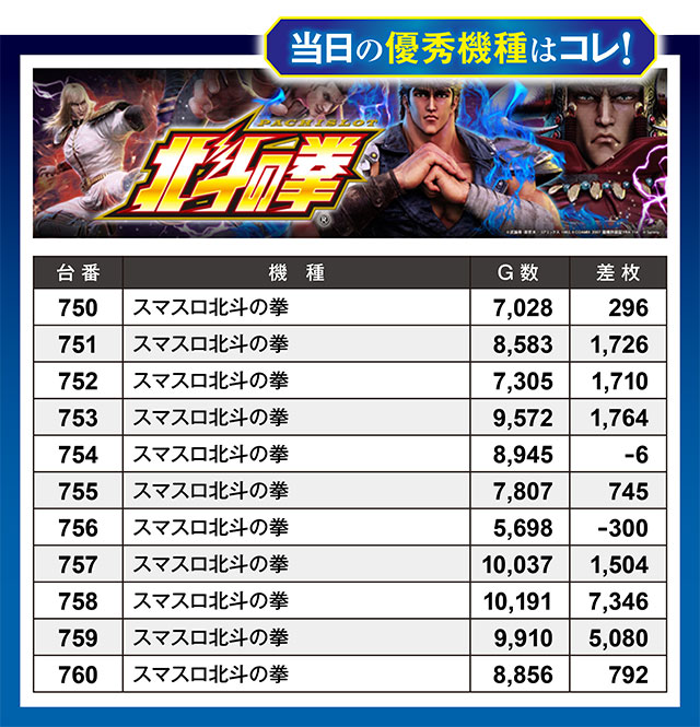 前回と同じく、11台中9台がプラスというとんでもない結果となった『スマスロ北斗の拳』。5,000枚オーバー台は2台に収まったものの、好環境だったのは間違いなさそうだ。