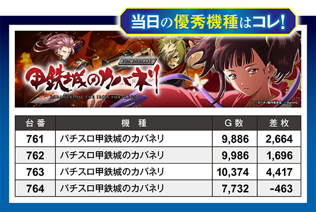764番台だけが惜しくもマイナスに…。しかし残る3台は好調だったようで、危なげなくプラス差枚でフィニッシュ!764番台も誤差レベルのマイナスだったのでは…?