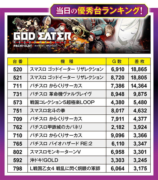 『スマスロ ゴッドイーター リザレクション』が18,000枚オーバー台で1・2フィニッシュ!にわかには信じがたいミラクルを巻き起こしてくれた。また『パチスロ からくりサーカス』からも14,000枚超えが生まれており、今回もハイレベルなランキングを披露!