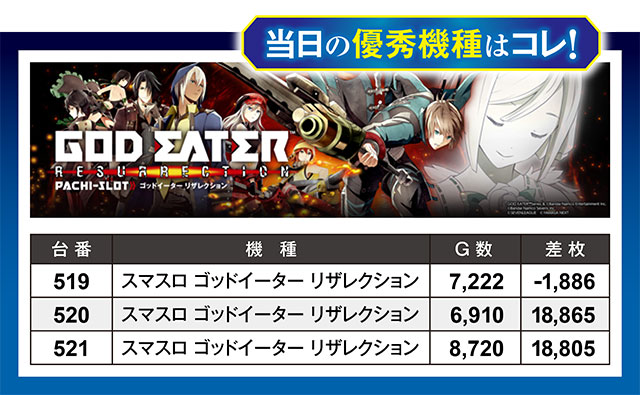 毎回高い勝率を誇る『スマスロ北斗の拳』の活躍もさることながら、この日のMVPは2台のコンプリートを生み出した『スマスロ ゴッドイーター リザレクション』で異論はないだろう。また『パチスロ からくりサーカス』も何気に全台プラスを達成しており、この日のパチスロコーナーは見どころだらけだったと言っても過言ではなかったようだ。