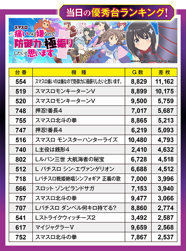 今回は10,000枚オーバー記録が2台誕生!トップ差枚となったのは意外にも『スマスロ痛いのは嫌なので防御力に極振りしたいと思います。』だった。そして2位・3位には『スマスロモンキーターンV』が連続入賞し、その強さをまざまざと見せつけることとなった。