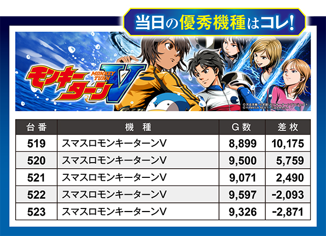 前回は全台プラスを達成した『スマスロモンキーターンV』だが、この日は2台がマイナスに。それでもトータル差枚は前回を大きく上回っており、平均差枚も2,692枚というずば抜けた結果となった。