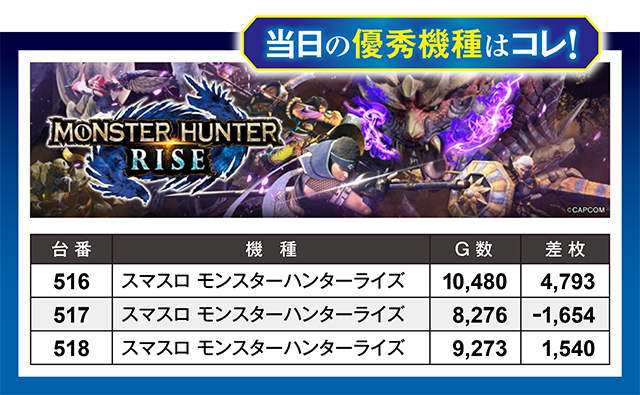 またしても1台だけがマイナスとなってしまった『スマスロ モンスターハンターライズ』。それでも3台の平均は1,560枚と高水準であり、誰の目にもチャンスが多かったことを確信させる結果に。