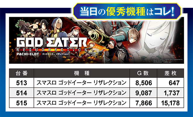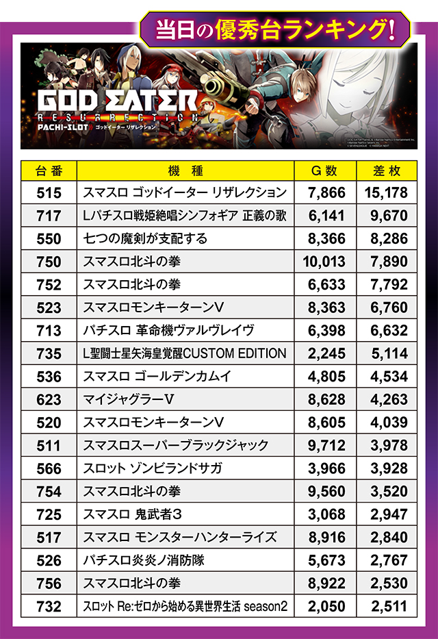 15,000枚を上回る記録で、今回の首位レコードの座に輝いたのは『スマスロ ゴッドイーター リザレクション』。次いで『Lパチスロ戦姫絶唱シンフォギア 正義の歌』『七つの魔剣が支配する』がランクインする結果に。1~10位の結果を見るに、前回とは大きく異なる顔ぶれであり、メイン機種以外にも活躍のチャンスがあったことを物語っていた。