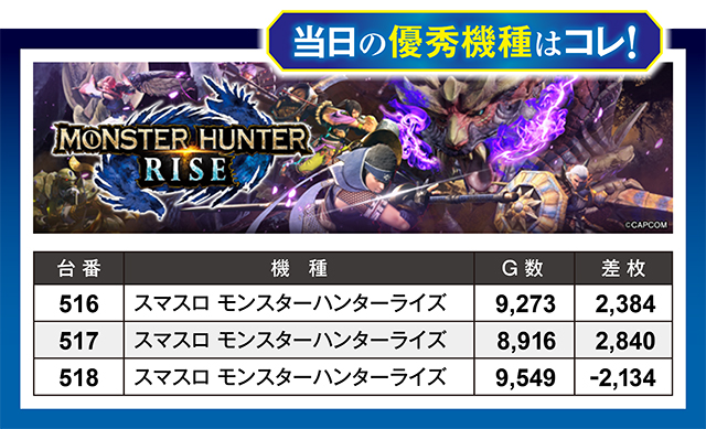 『スマスロ モンスターハンターライズ』は3台中2台が2,000枚超えと、まずまずの結果。マイナスとなった518番台も挙動は悪くなかったため、全台プラスも十分射程距離内ではあったが、叶わぬ結果となってしまった。