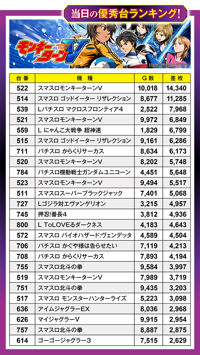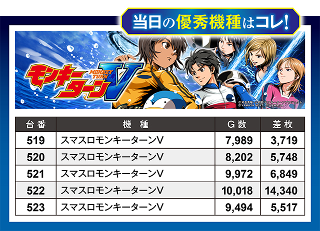 ご覧の通り、非常に優秀な結果となった『スマスロモンキーターンV』。5台すべてがプラスとなったばかりか、522番台はこの日の最高差枚記録をマーク!5台ともが3,500枚を上回るとは、恐るべし…!