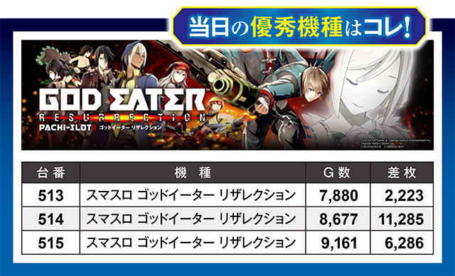 前回も好調だった『スマスロ ゴッドイーター リザレクション』が、引き続き大活躍!全台プラスに加え、またしても10,000枚オーバー記録を叩き出してくれた。次回も注目すべき…?
