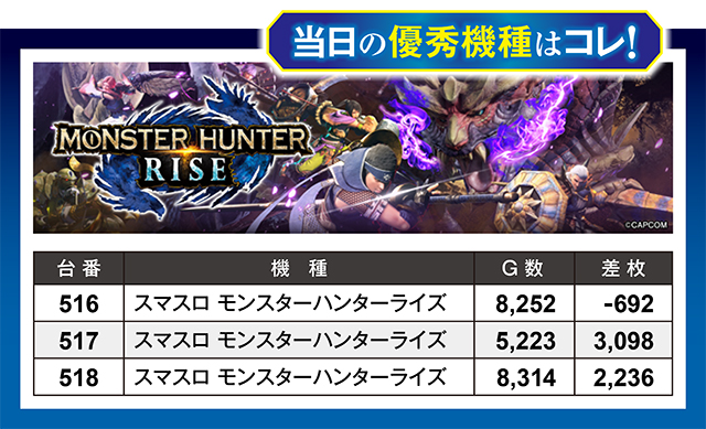 今回も1台だけがマイナスとなってしまった『スマスロ モンスターハンターライズ』。小さなマイナスではあるものの、2連続で全台プラスを逃す結果となってしまった。
